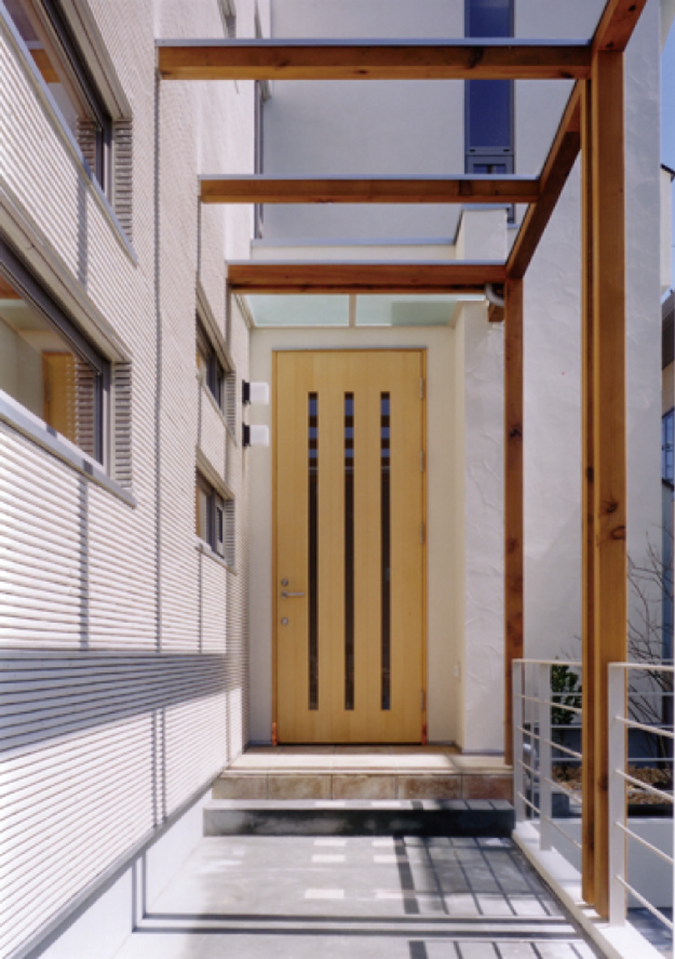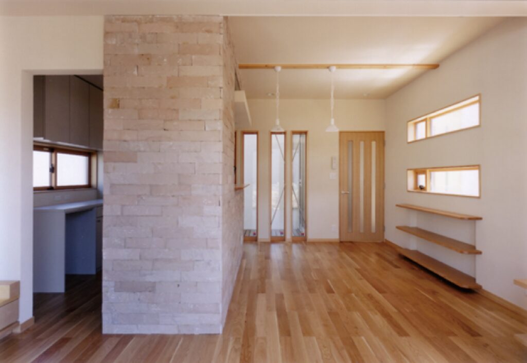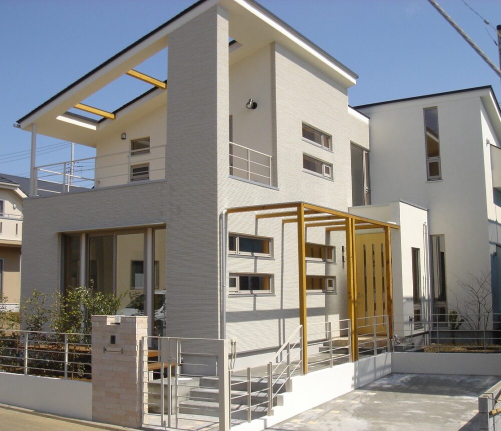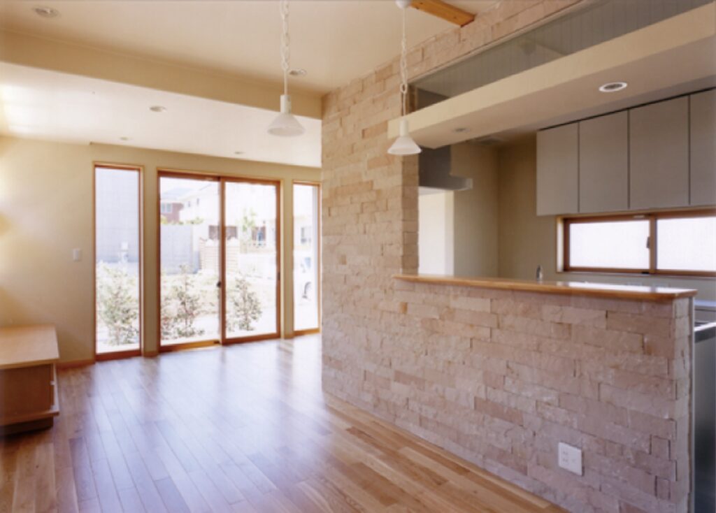 敷地は閑静な新興住宅地に立地しています。建物配置は道路側をパブリック、奥をプライベートゾーンに分け、中間に玄関・ホール・中庭を繋ぎの緩衝スペースとして設けています。内外の仕上げは石・塗り壁・珪藻土・無垢材等ナチュラルな馴染みやすい素材・カラーです。外部は屋根を天然スレート・外壁に一部対汚染性の細割ボーダータイル等、耐久性のある仕上とし、ライフサイクルコストを抑えるように意図した。また、断熱は外断熱工法を採用し、省エネ・快適性にも配慮。2Fの個室・寝室は屋根勾配に合わせて天井を高くし、心地よく安らげる場です。