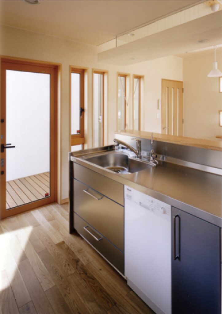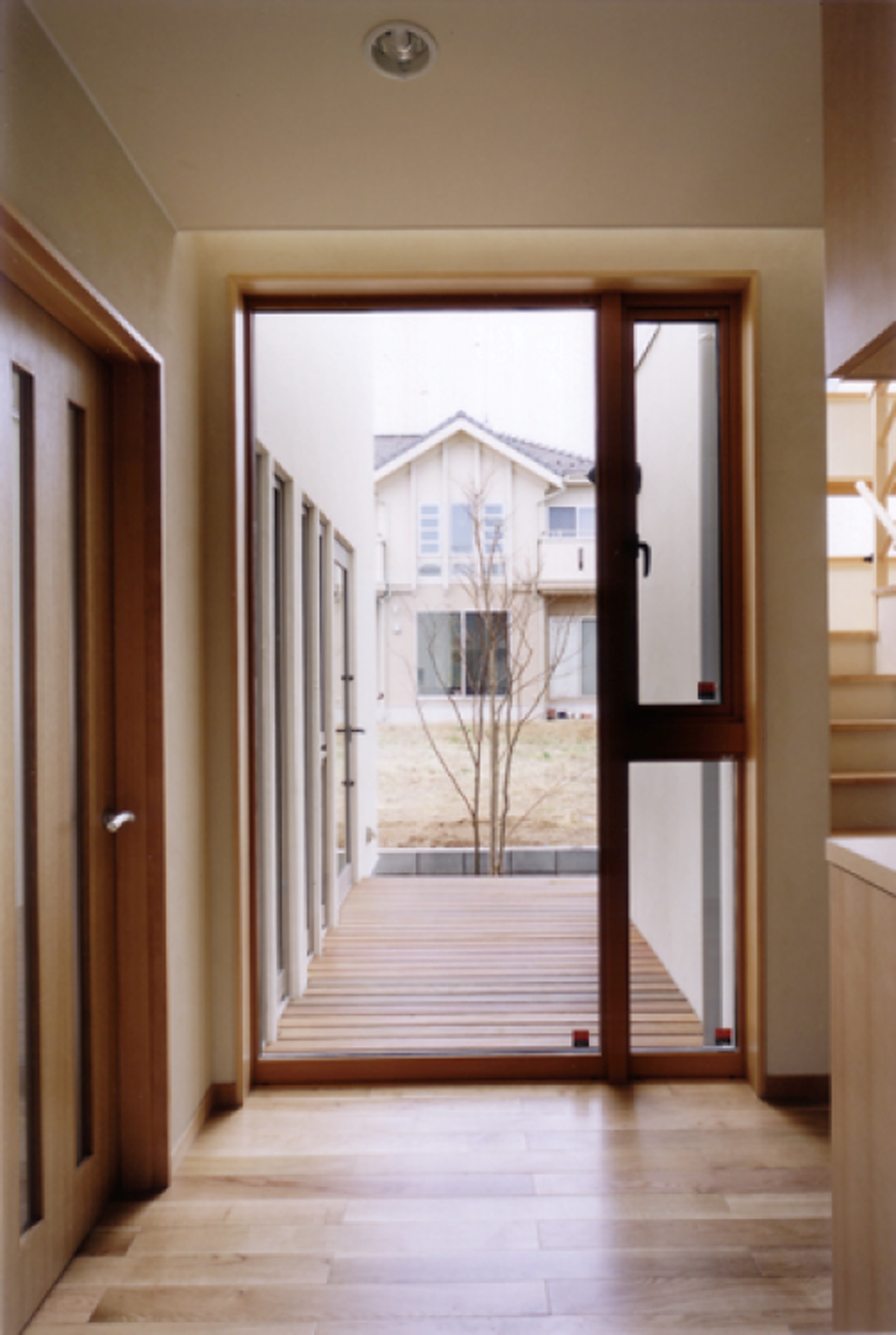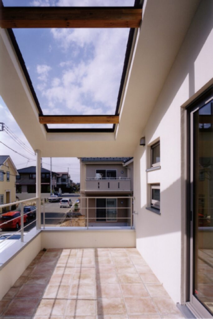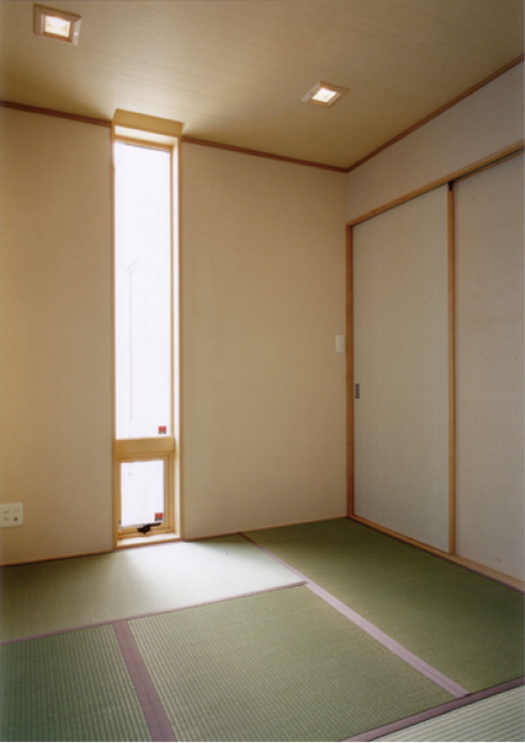 敷地は閑静な新興住宅地に立地しています。建物配置は道路側をパブリック、奥をプライベートゾーンに分け、中間に玄関・ホール・中庭を繋ぎの緩衝スペースとして設けています。内外の仕上げは石・塗り壁・珪藻土・無垢材等ナチュラルな馴染みやすい素材・カラーです。外部は屋根を天然スレート・外壁に一部対汚染性の細割ボーダータイル等、耐久性のある仕上とし、ライフサイクルコストを抑えるように意図した。また、断熱は外断熱工法を採用し、省エネ・快適性にも配慮。2Fの個室・寝室は屋根勾配に合わせて天井を高くし、心地よく安らげる場です。
