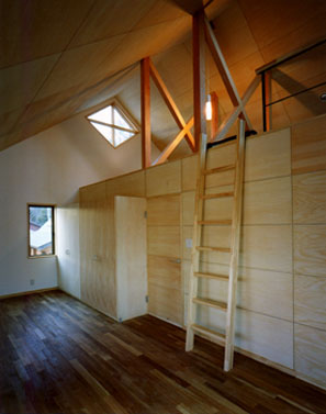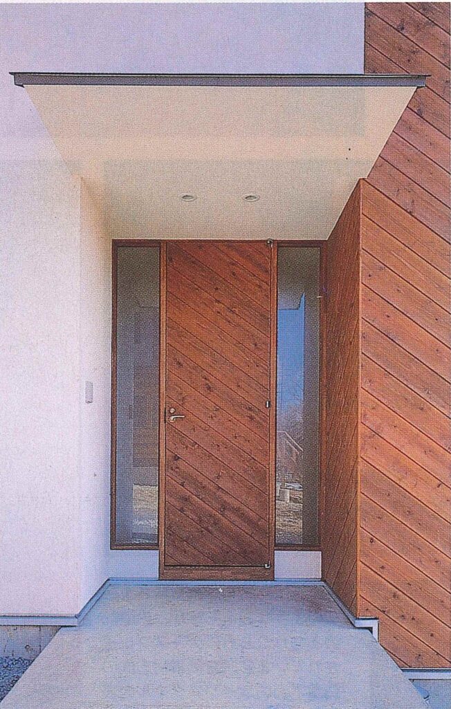八ヶ岳の山麓に位置する大学教授の住宅。外観は漆喰風の白壁に対して斜めの板張りがアクセントになっています。蔵書数が多いので書斎の本棚を中心にプランニングしました。無垢のフローリングに黄土色の塗り壁という自然素材と、壁・天井は一部すっきりしたシナ合板の組み合わせを表現。寒冷地のため高気密・高断熱仕様にしています。