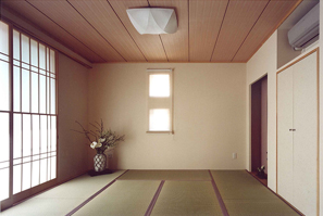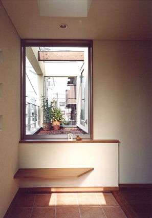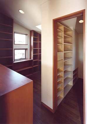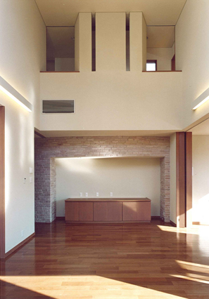 閑静な住宅街で、東側は緑地を借景に開けています。道路面とのレベル差を生かし、半地下のビルトイン・ガレージ、2Fの書斎との中間を利用し広い容量の納戸を設けました。外観はベージュの塗り壁と淡いピンクがかった砂岩の割り肌上の壁を立体的に構成し、奥行き間のあるファサードになります。青い空との素材・カラーの対比が印象的です。建物本体は緩やかな片流れ屋根を架け、中央部にくり抜いたルーフテラスが深みを与えています。内部は大きな吹き抜けのあるリビングを中心に、機能的な間取りと要所には収納を多く設け、水廻りも充実。外構も庭側に広いウッドデッキを設けて、アウトドアを快適に取り込んでいます。